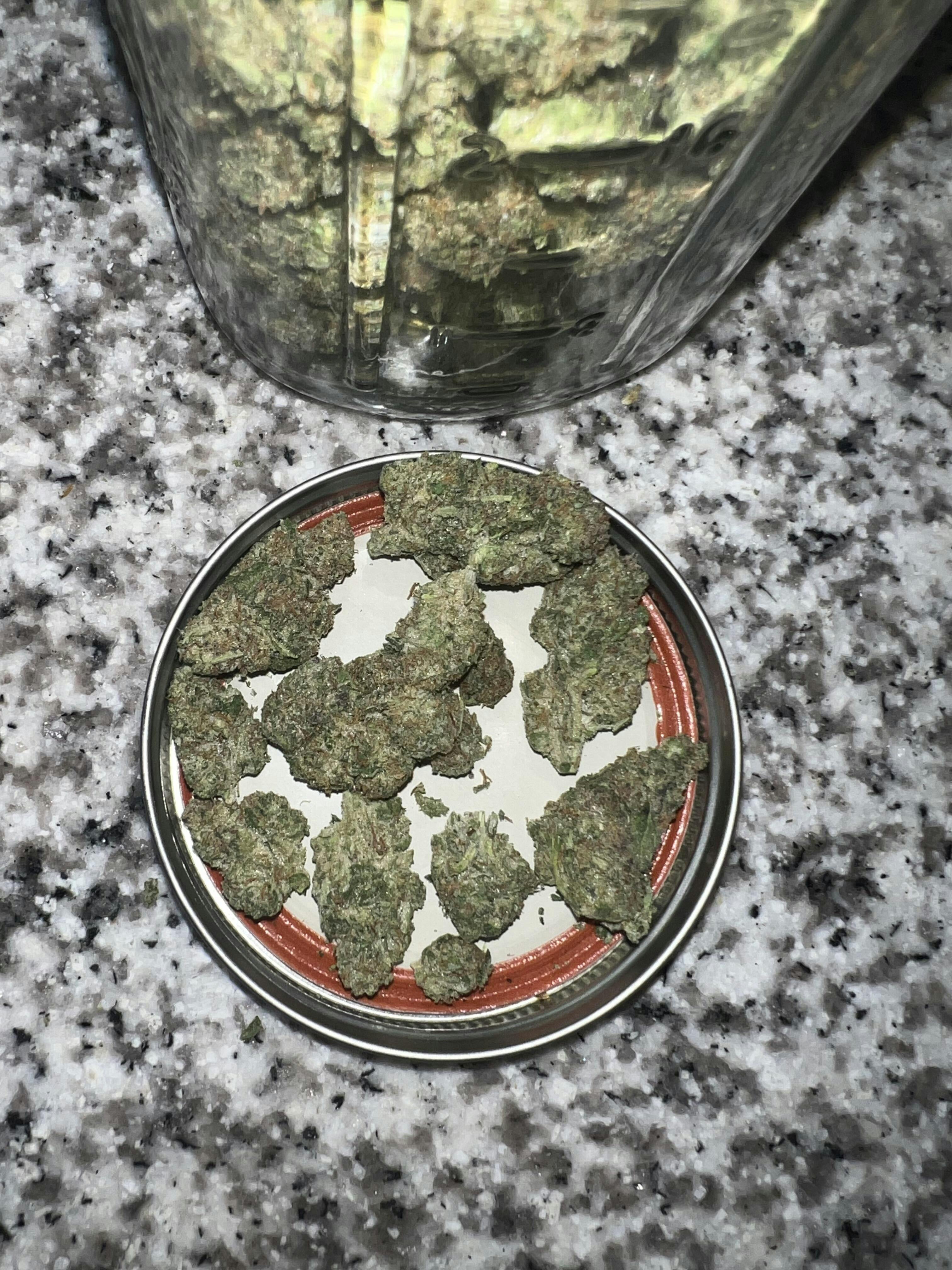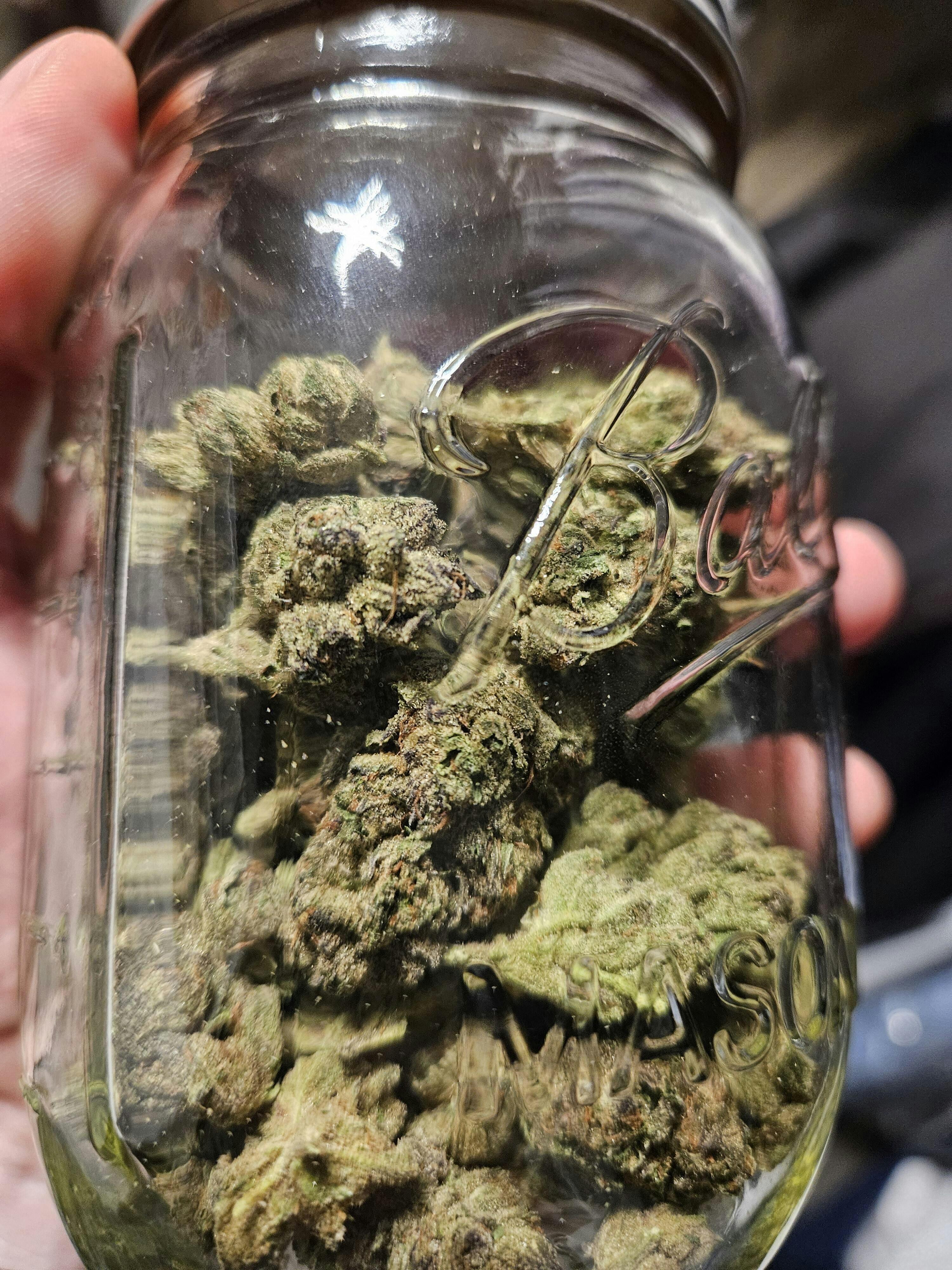 • Dense, resin-coated buds with high THC potency