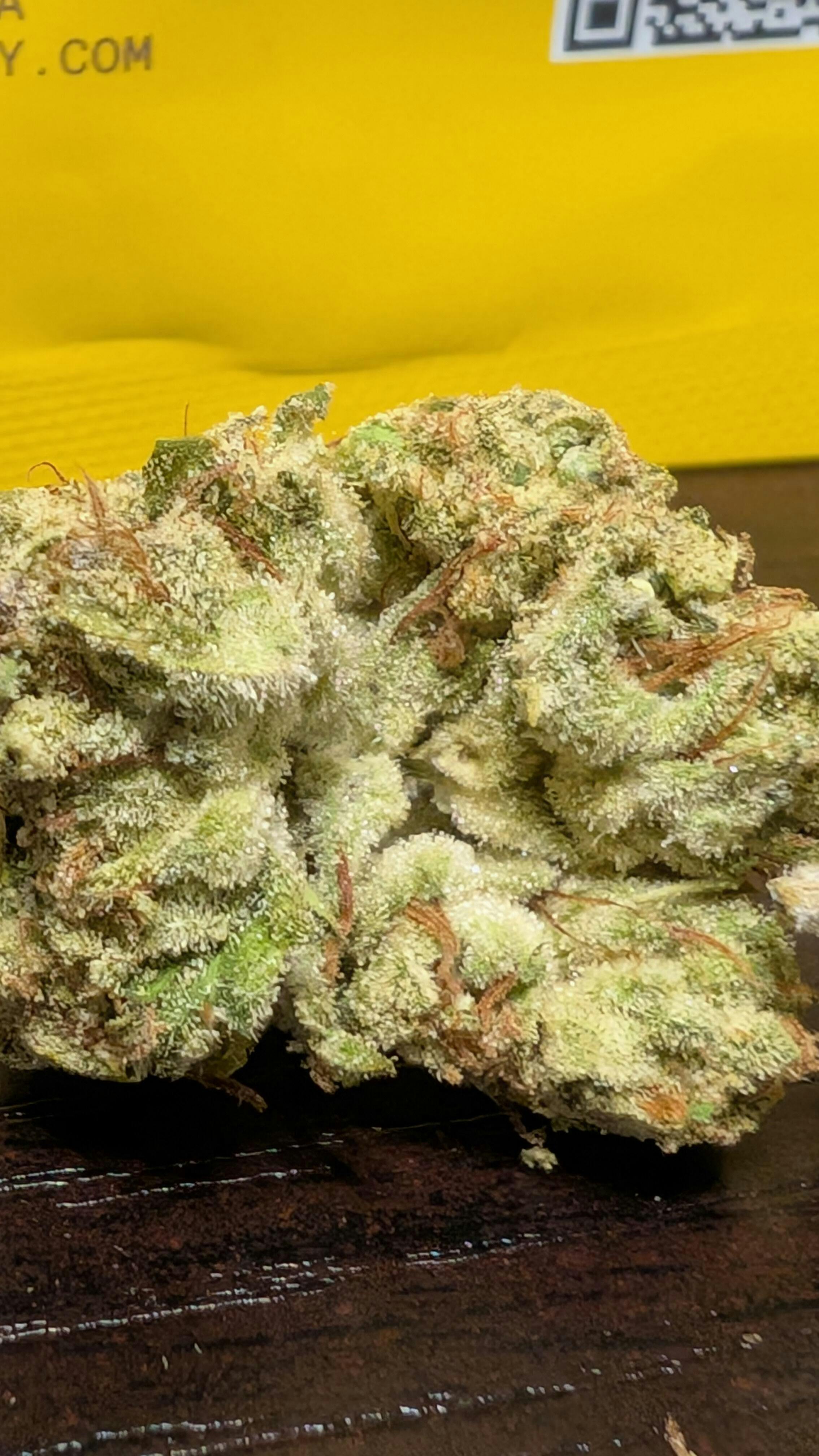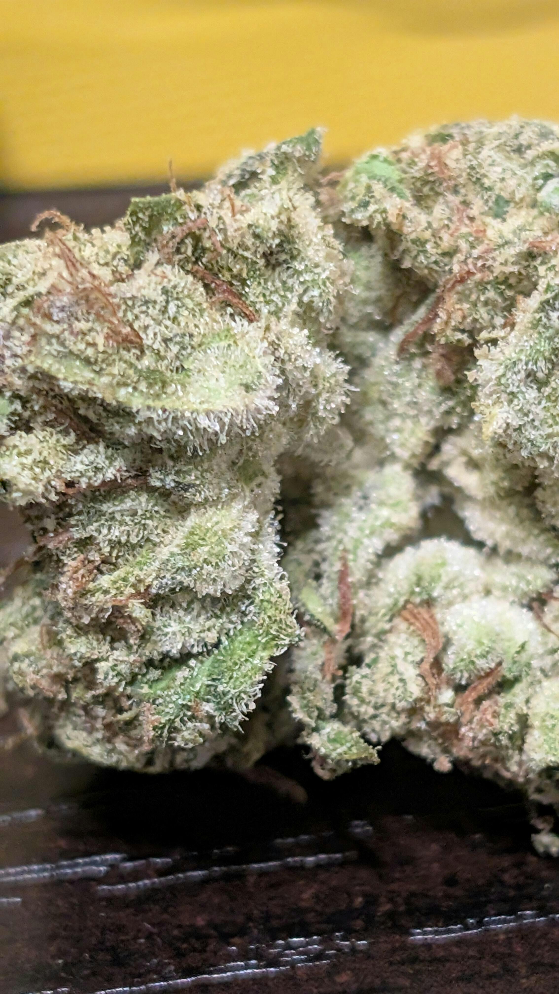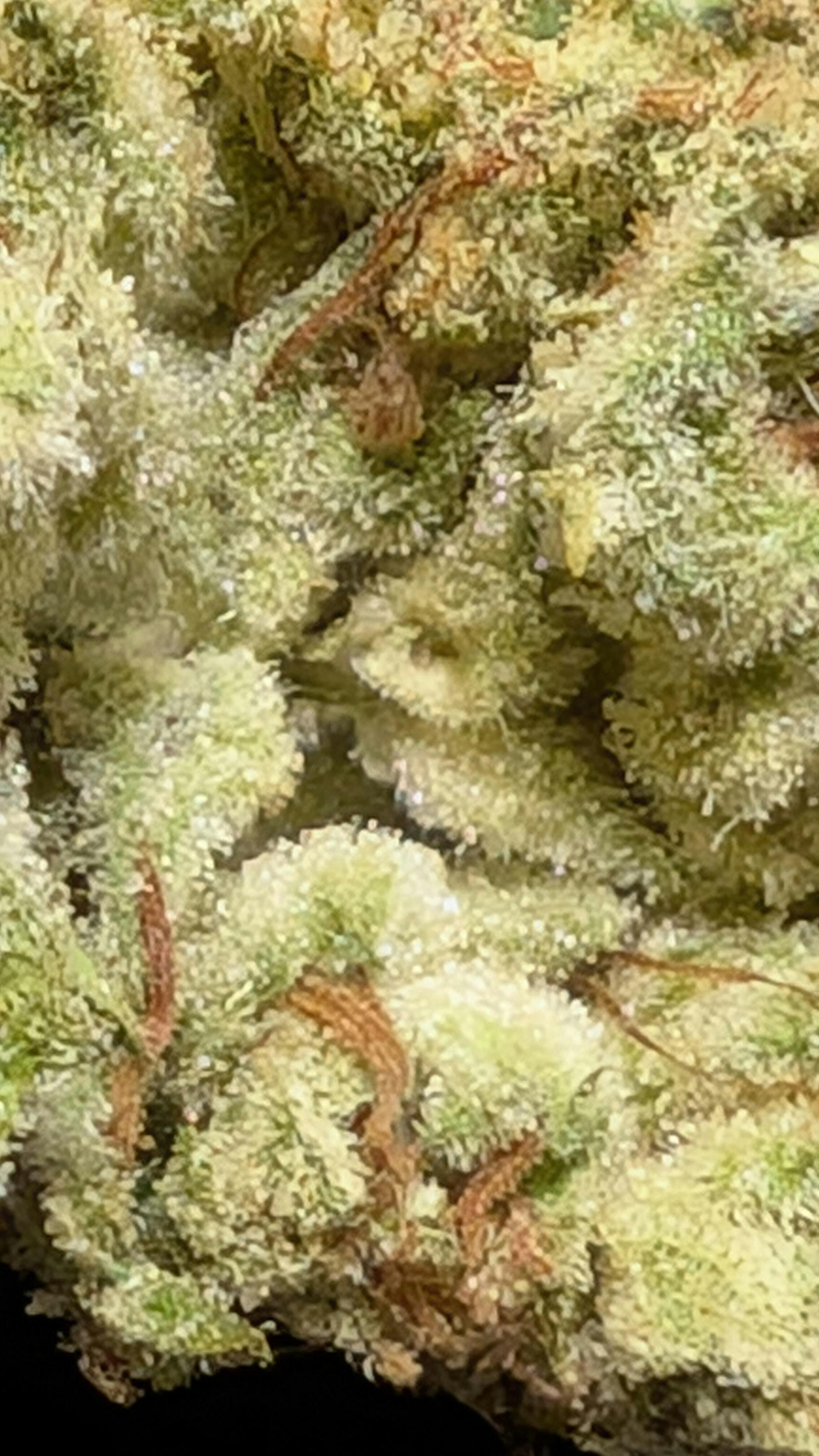• Dense, resin-coated buds with high THC potency