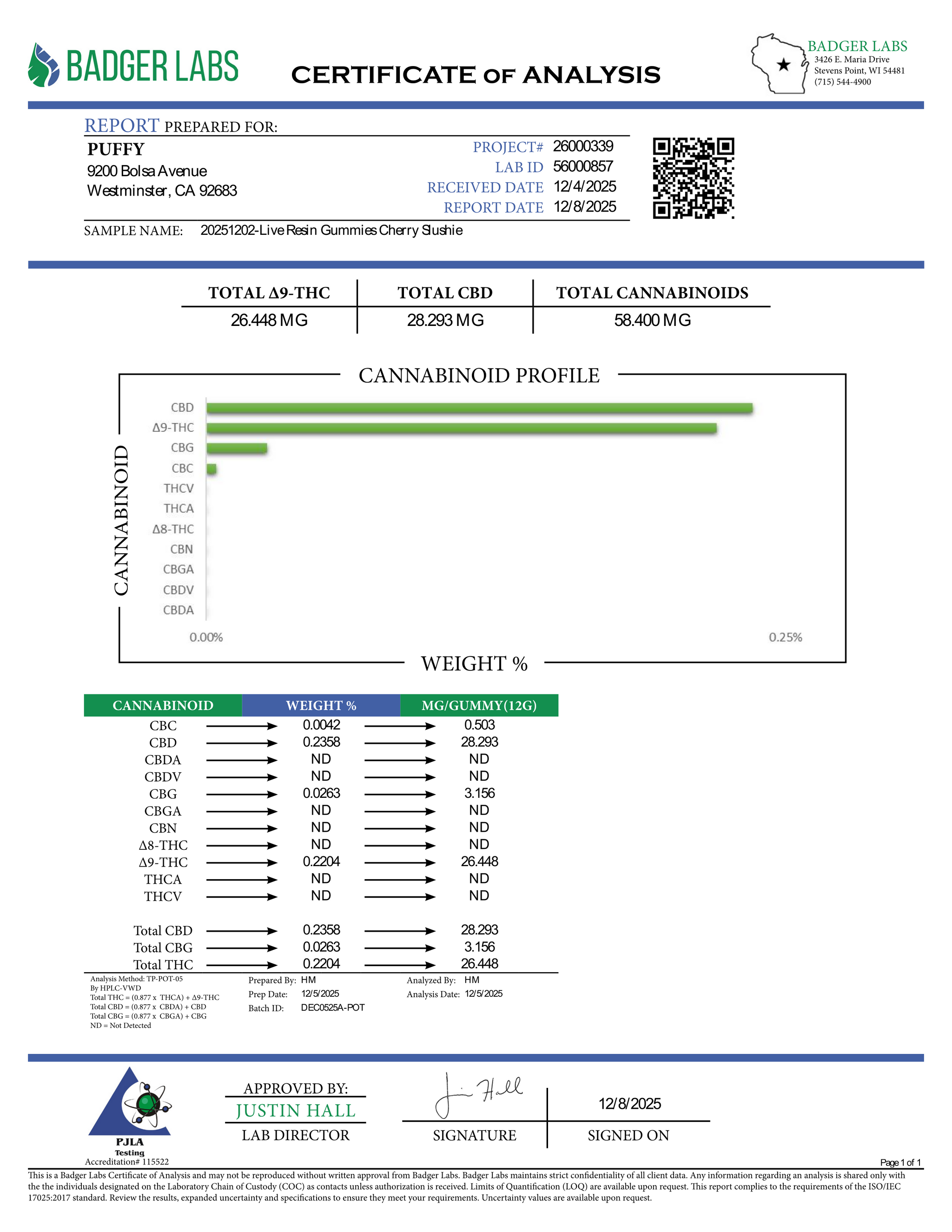 Each vegan 9-gram gummy contains a balanced 25 mg CBD : 25 mg natural Delta-9 THC, infused with cannabis-derived terpenes plus minor cannabinoids CBG CBN THCv for a full-spectrum entourage effect.