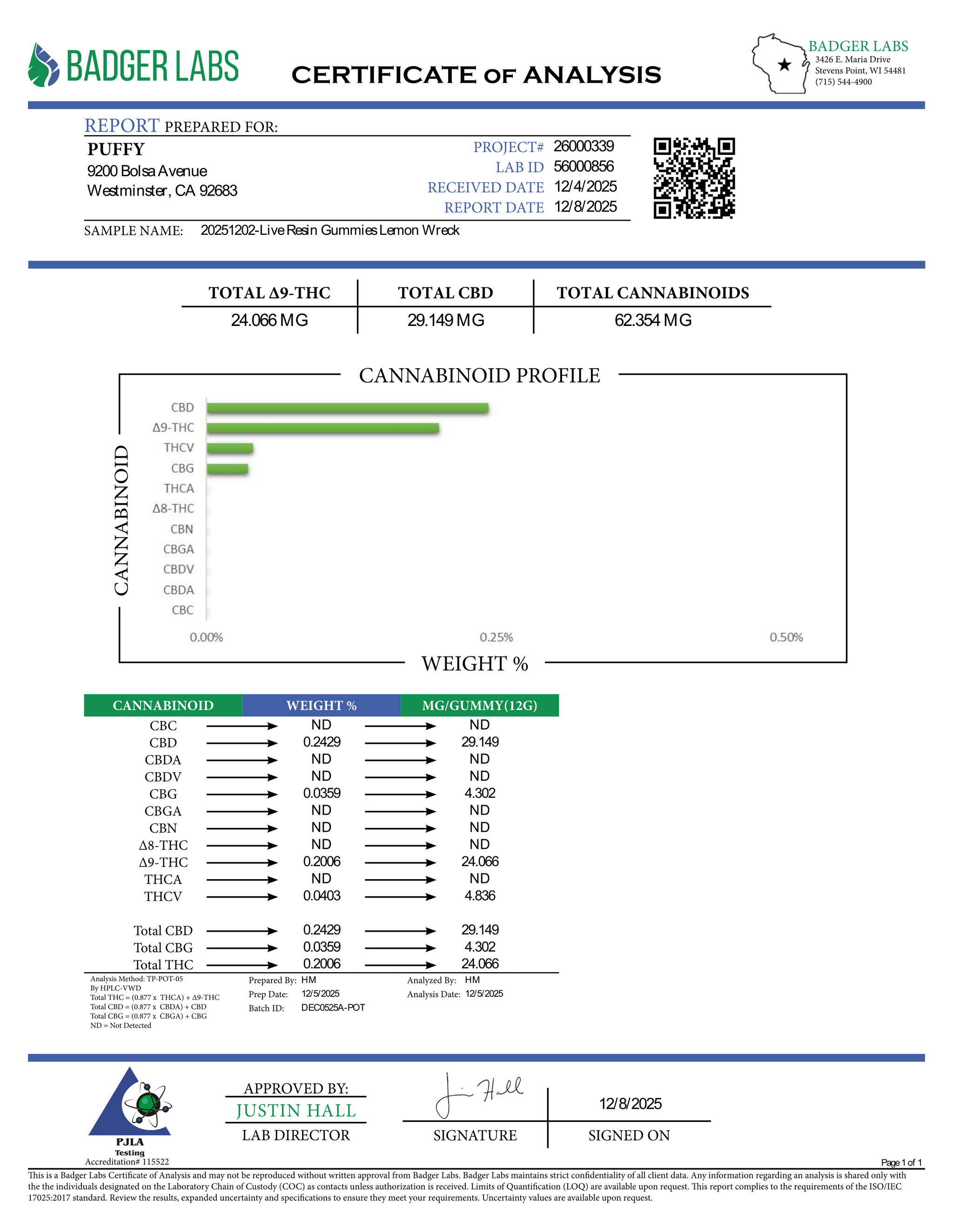Each vegan 9-gram gummy contains a balanced 25 mg CBD : 25 mg natural Delta-9 THC, infused with cannabis-derived terpenes plus minor cannabinoids CBG CBN THCv for a full-spectrum entourage effect.