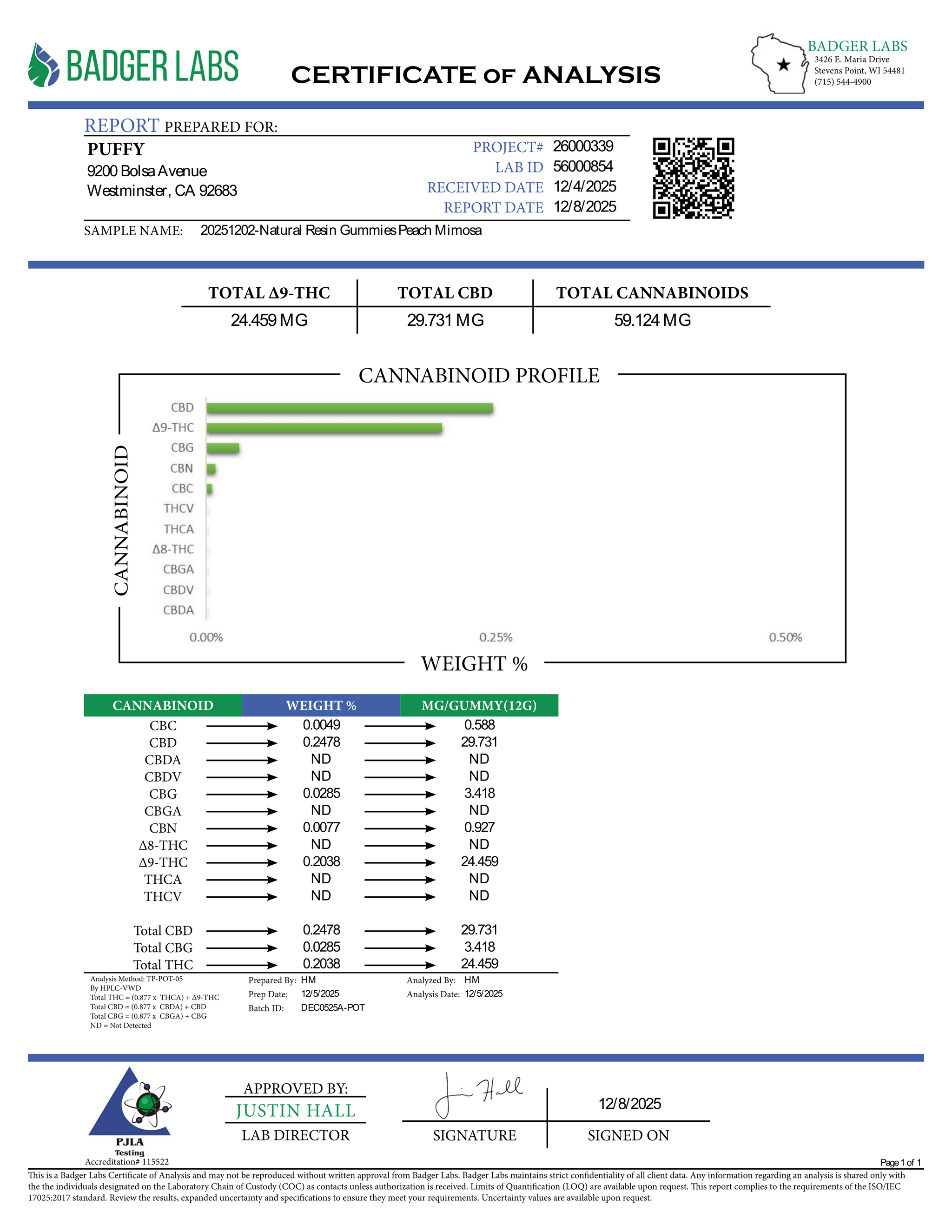 Each vegan 9-gram gummy contains a balanced 25 mg CBD : 25 mg natural Delta-9 THC, infused with cannabis-derived terpenes plus minor cannabinoids CBG CBN THCv for a full-spectrum entourage effect.